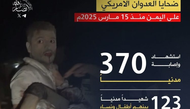 أفادت وزارة الصحة والبيئة بأن عدد ضحايا العدوان الأمريكي على الأعيان المدنية بلغ 370 مواطناً منذ 16 مارس الماضي.