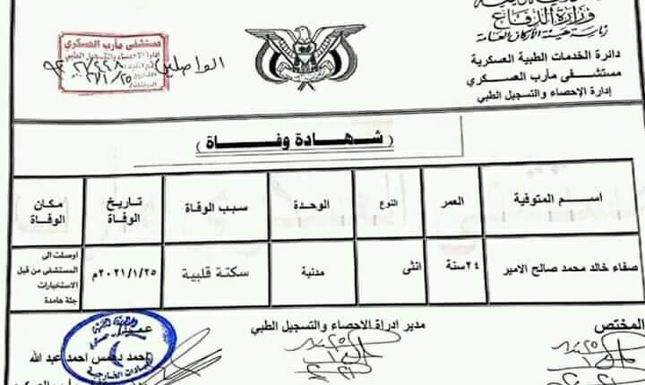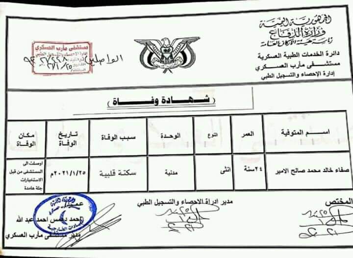وأوضح مصدر محلي بالمحافظة لوكالة الأنباء اليمنية (سبأ) أن وفاة المواطنة صفاء خالد محمد صالح الأمير البالغة من العمر 24 عاما من أبناء محافظة تعز، جاء بعد اعتقالها في سجن ما يسمى بالاستخبارات منذ شهرين، جراء التعذيب الجسدي والنفسي الذي تعرضت له.