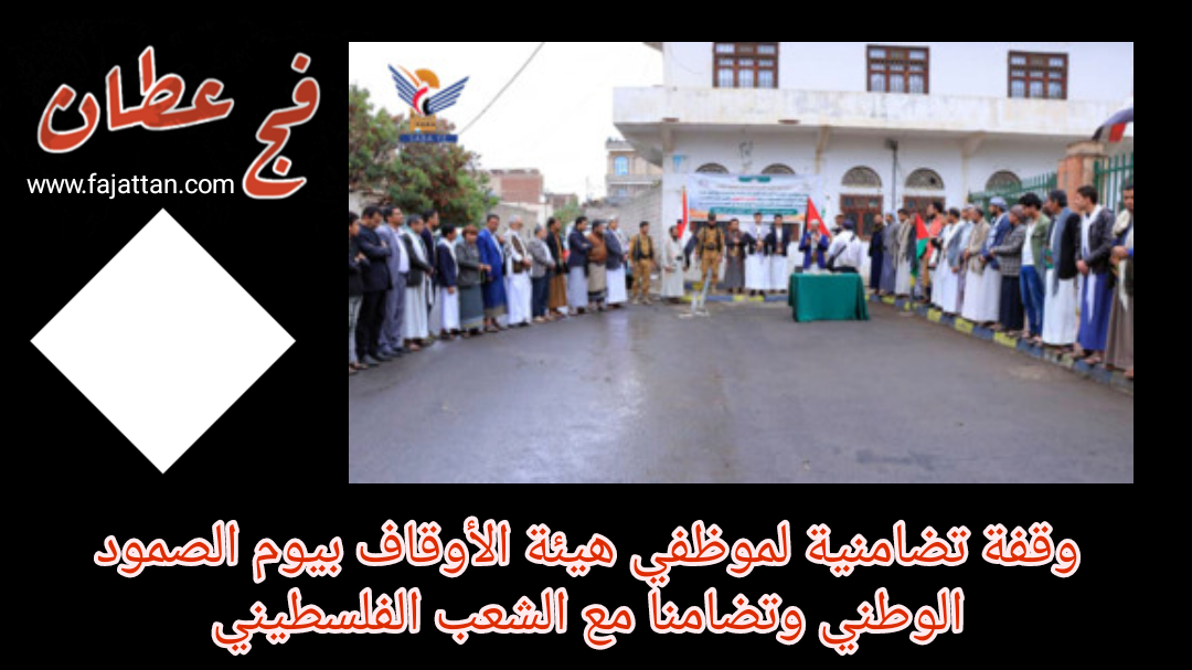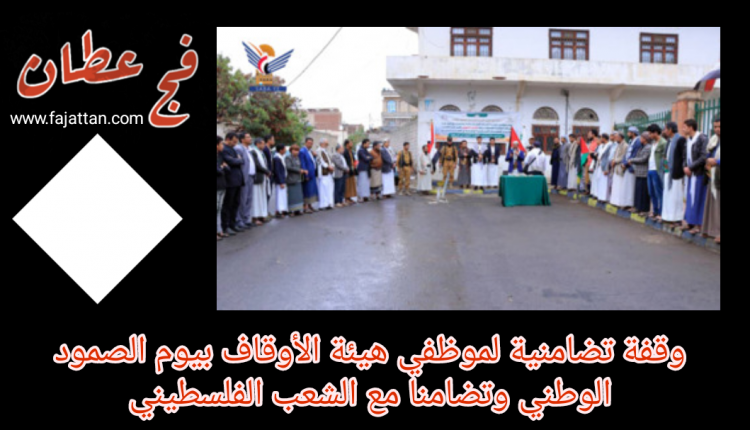 نظم موظفو الهيئة العامة للأوقاف اليوم، وقفة تضامنية مع أهل غزة والمقاومة الفلسطينية، ورفضا للعدوان على غزة واليمن، وتأييدا للعمليات العسكرية اليمنية في الممرات البحرية وتزامنا مع اليوم الوطني للصمود.