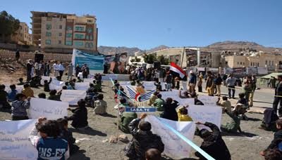 نظم فريق معاً للأفضل بالتنسيق مع المجلس الأعلى لمنظمات المجتمع المدني اليوم وقفة إحتجاجية أمام القاعة الكبرى بالعاصمة صنعاء للتنديد بإستمرار العدوان السعودي الأمريكي على اليمن.
