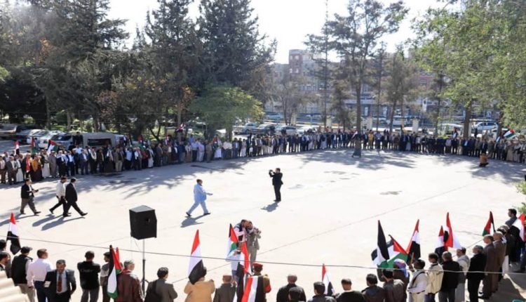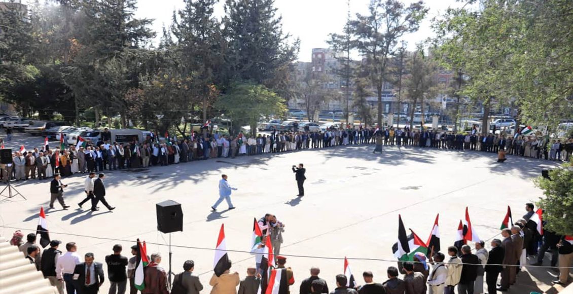 وأكد بيان صادر عن الوقفة ألقاه وكيل وزارة المالية المساعد لقطاع التنظيم وحسابات الحكومة وليد فائع، مباركة وتأييد الضربات التي تقوم بها القوات المسلحة اليمنية ضد الكيان الصهيوني بالصواريخ البالستية والمجنحة والطائرات المسيرة.
