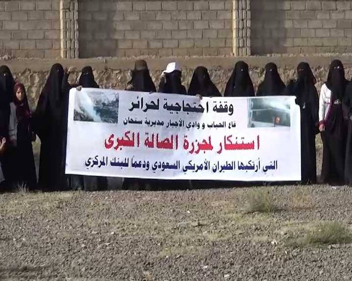 وفي الوقفة استنكرت حرائر قاع الحباب ووادي الأجبار بمديرية سنحان الجريمة البشعة بحق المئات من أبناء الشعب اليمني وغيرها من الجرائم التي يرتكبها طيران العدوان السعودي الأمريكي دون وجه حق، والتي يقتل فيها الأطفال والنساء ويهدم المنازل والبنى التحتية لليمن، محملات العالم ومنظماته الإنسانية مسؤولية الصمت عن جرائم العدوان واستمرارها.