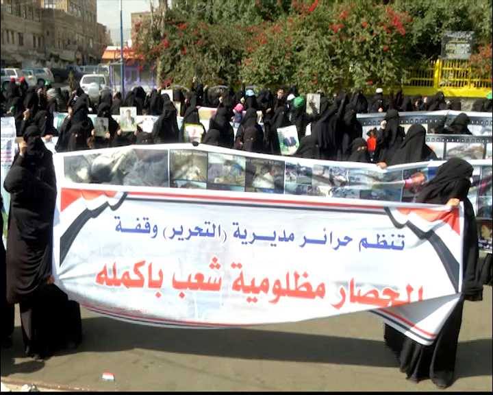 نددت حرائر مديرية التحرير بأمانة العاصمة اليوم السبت باستمرار صمت الأمم المتحدة ومنظمات المجتمع الدولي على جرائم العدوان وتبعات الحصار الأمريكي السعودي المستمرة على الشعب اليمني وذلك في وقفة احتجاجية نفذنها اليوم الاثنين بميدان التحرير وسط العاصمة.