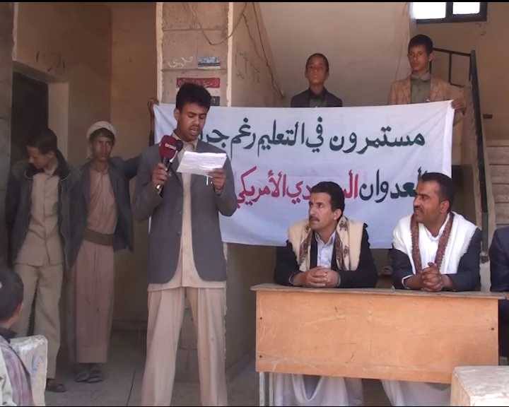 نظم طلاب مدرسة عذبان بمديرية الوحدة بالأمانة وطلاب مديرية جحانة بمحافظة صنعاء اليوم الاثنين وقفتين منفصلتين تنديدا بجرائم العدوان السعودي الأمريكي بحق اليمنيين.