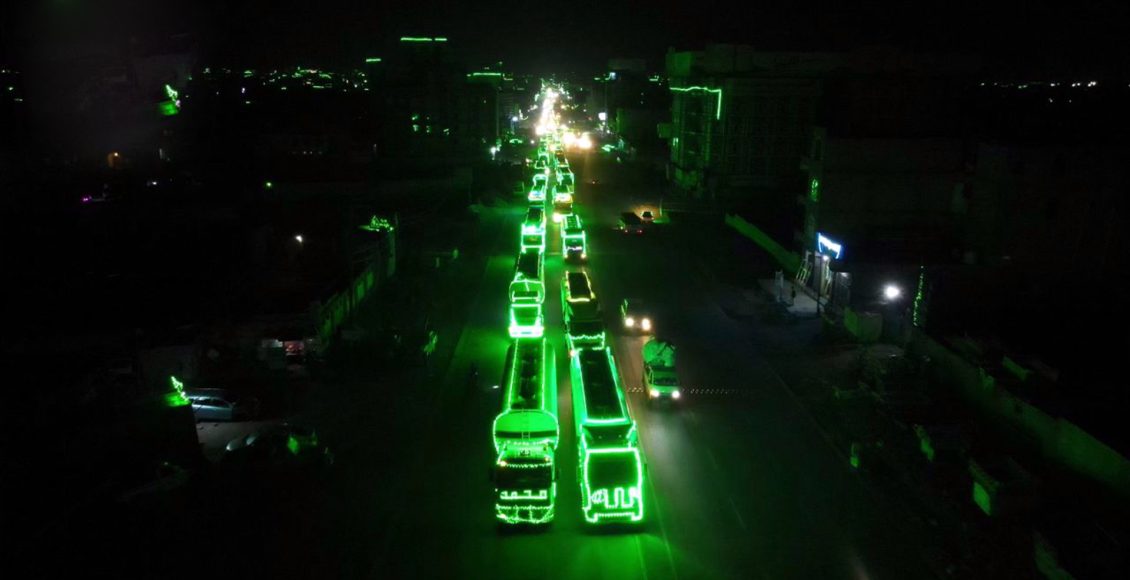 جابت مسيرة ضوئية تضم 100 قاطرة بترولية متوهجة باللون الأخضر عدداً من شوارع مدينة ذمار احتفاء بذكرى المولد النبوي الشريف.